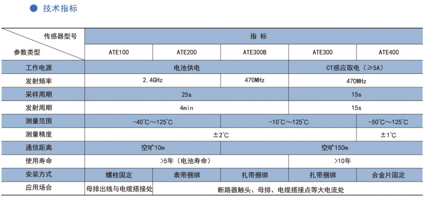 ATE100螺栓式傳感器采用螺栓式固定在測溫接點處,一般較適應于安裝在母排出現與電纜搭接頭處。