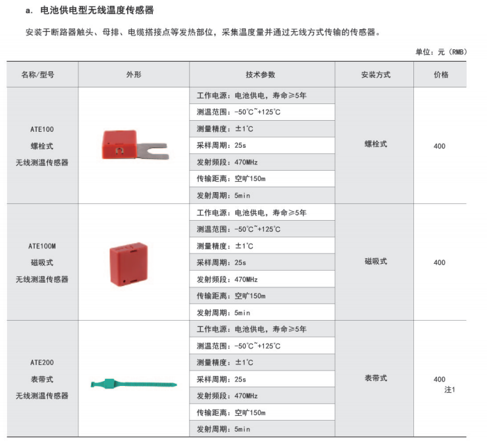 螺栓式無線測溫傳感器ATE100:采用螺栓式固定在測溫接點處,一般較適應于安裝在母排出現與電纜搭接頭處。