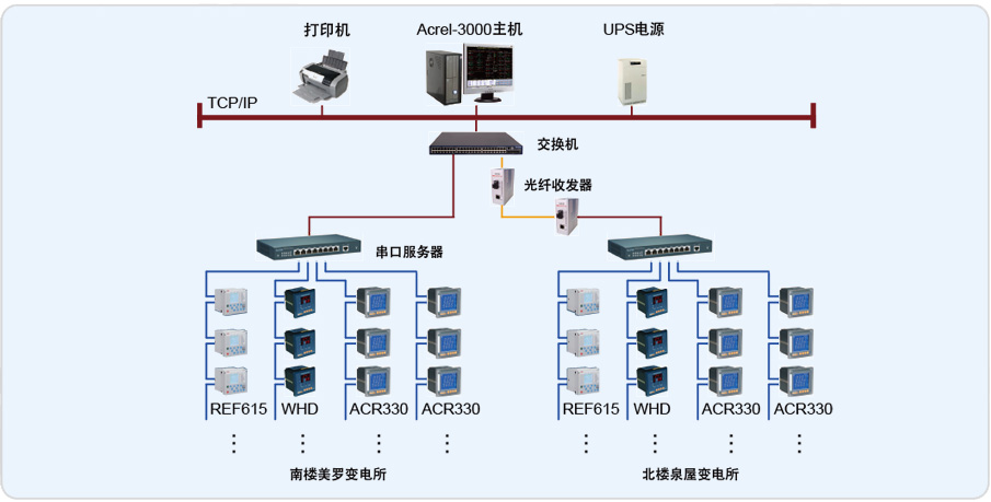 該系統(tǒng)總計有352只儀表(其中包括330只ACR網(wǎng)絡(luò)多功能電力儀表,12只ABB綜合保護裝置,10只變壓器溫控儀),分20條總線,其中北樓泉屋變電所8條總線,南樓美羅變電所12條總線,兩變電所之間距離較遠,采用光纖組網(wǎng)連接,再通過網(wǎng)線拉至南樓美羅變電所值班室連接到監(jiān)控主機實現(xiàn)總線上儀表與監(jiān)控主機的數(shù)據(jù)連通。
