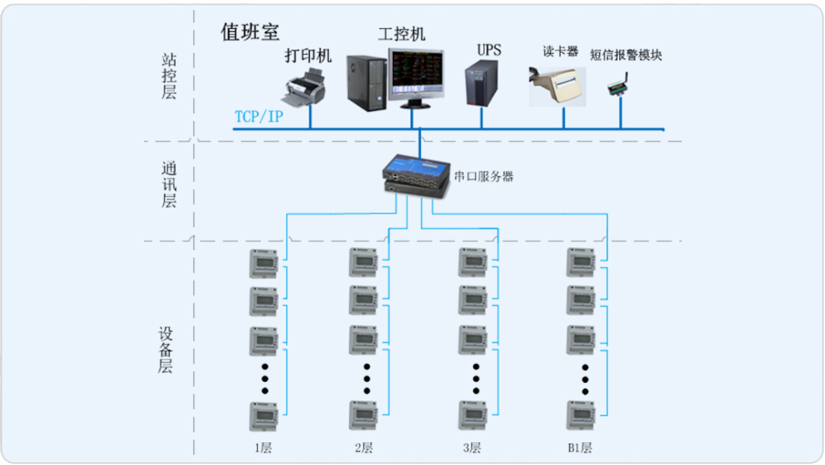 本系統(tǒng)主要實現(xiàn)對匯京國際廣場進行用電監(jiān)控與電能管理。監(jiān)控范圍為樓層DTSY1352-C商戶預付費儀表65塊,總線直接接入B1層值班室內(nèi)串口服務器,從而在監(jiān)控主機上實現(xiàn)總線上儀表與監(jiān)控主機的數(shù)據(jù)連通。通過使用Acrel-3000智能預付費管理系統(tǒng)解決了由于商戶較多,管理不方便的問題,這樣既管理方便、又節(jié)省人力,大大減少了物業(yè)的投入。