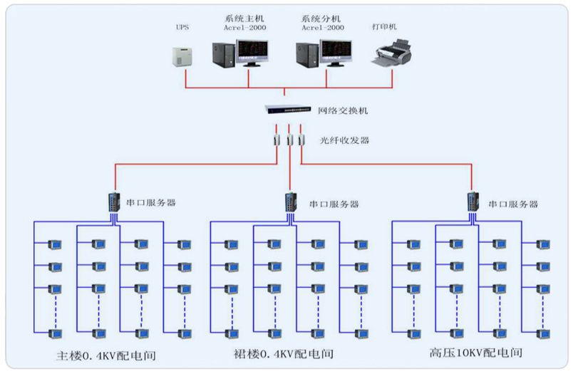 系統(tǒng)采用Acrel-2000型電力監(jiān)控系統(tǒng),整個(gè)系統(tǒng)采用網(wǎng)絡(luò)分布式結(jié)構(gòu),包含主樓0.4KV低壓配電室,裙樓0.4KV低壓配電室,10KV高壓配電室三個(gè)區(qū)域,3個(gè)數(shù)據(jù)采集箱。監(jiān)控主機(jī)位于主樓地下一層的辦公室,監(jiān)控分機(jī)位于主樓一層的消控中心,所有配電回路均配備安科瑞電力儀表PZ系列。該項(xiàng)目實(shí)現(xiàn)了福州郵政廣場(chǎng)2棟樓內(nèi)電力系統(tǒng)的智能管理。所有監(jiān)控設(shè)備均通過(guò)屏蔽雙絞線至各自配電室內(nèi)的串口服務(wù)器,再通過(guò)光電轉(zhuǎn)換器經(jīng)過(guò)光纖將數(shù)據(jù)傳輸至主樓地下一層的辦公室,從而實(shí)現(xiàn)遠(yuǎn)程監(jiān)控。