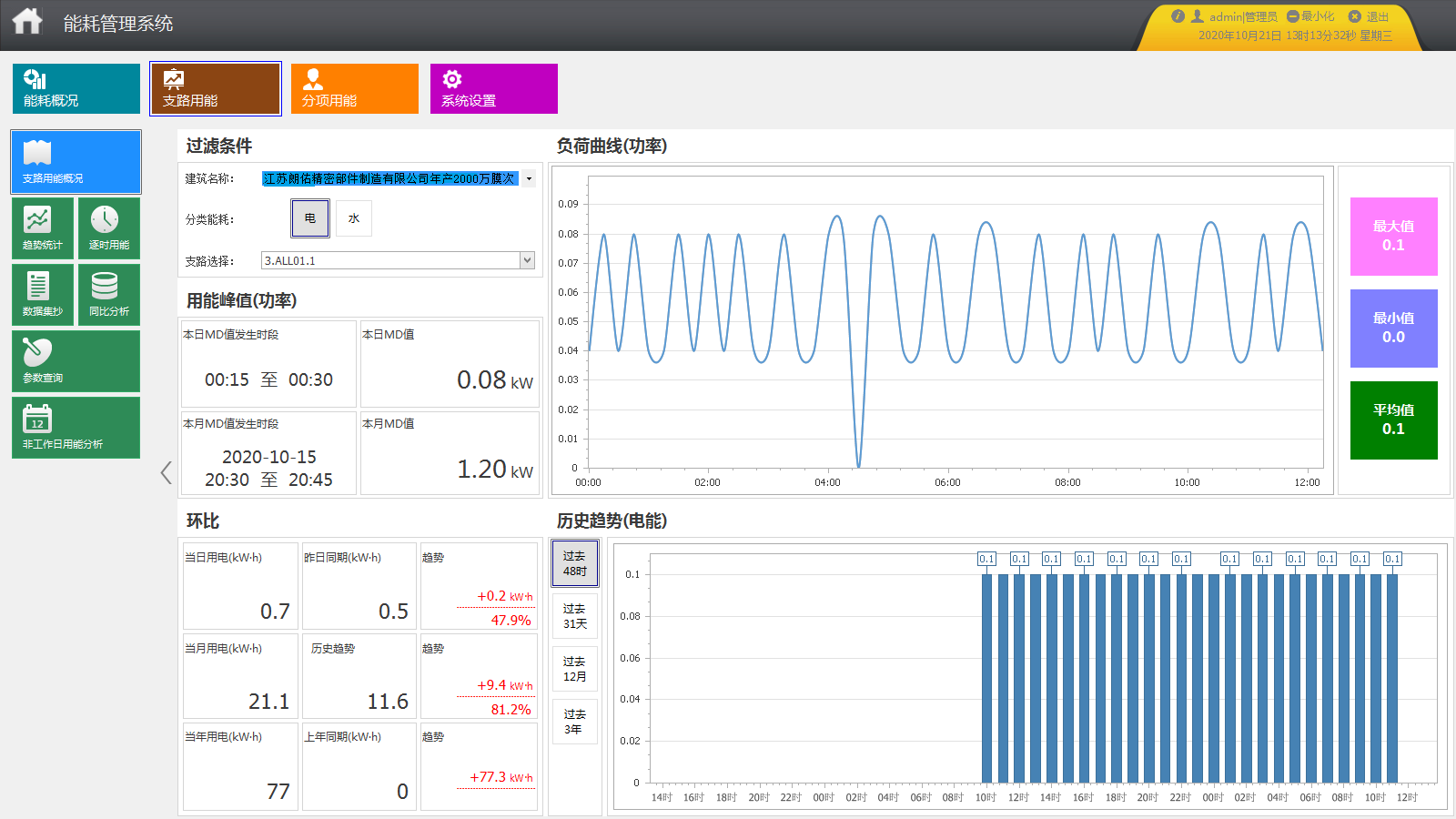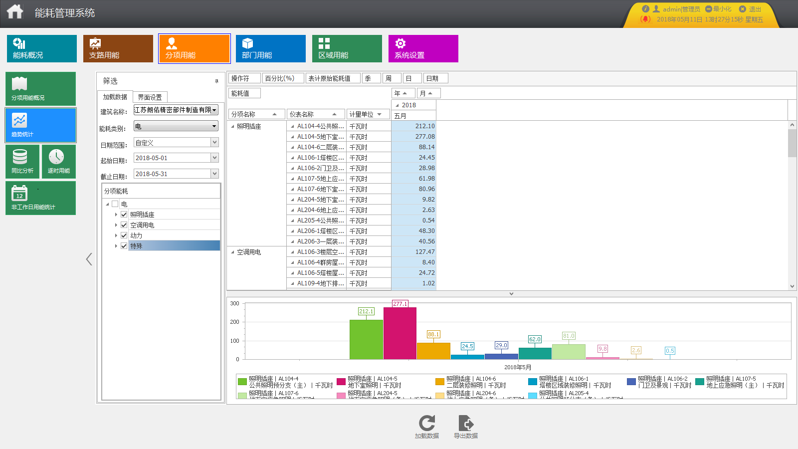 系統(tǒng)可以統(tǒng)計各支路某段時間內(nèi)逐日、逐周、逐月、逐季、逐年用能。系統(tǒng)可查看各支路用能趨勢,可根據(jù)已有的日期或者自定義時間進行查詢,并可以將支路用能顯示合計,以圖表形式顯示。 u 分項能耗統(tǒng)計