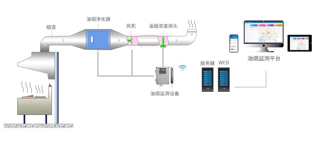 靠人力監(jiān)管無法實現(xiàn)全覆蓋;凈化設(shè)備難以查看;監(jiān)測需要專業(yè)手段,難度大。環(huán)保監(jiān)管部門存在檢測周期長、費用高、步驟繁瑣、現(xiàn)場測試條件要求高、不能實現(xiàn)多點監(jiān)測和實時在線監(jiān)測、無法準(zhǔn)確掌握整個飲食行業(yè)的油煙排放情況等問題。