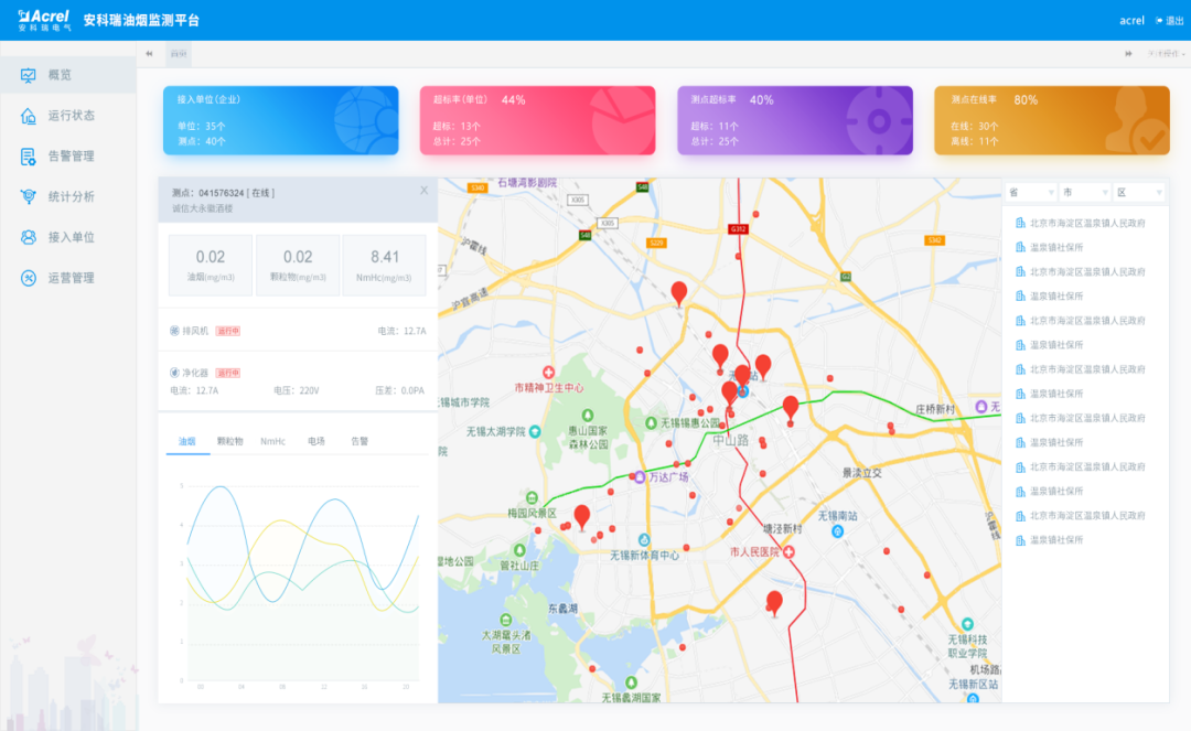 整體監(jiān)控解決了餐飲企業(yè)眾多且分散不能及時統(tǒng)計排放濃度、凈化器清潔度、排放過程是否進行凈化處理等關(guān)鍵信息的難題。該平臺解決了上述難題,可實行整體實時監(jiān)控,提高了監(jiān)控頻次,降低了人力物力成本。