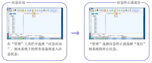 正常情況下本系統與消防火災報警主機通過開關量輸入或RS232通訊方式保持相連,有火災報警情況時,本系統將自動啟動應急狀態(標志燈常亮、照明燈亮起)。若手動模擬啟動應急與復位參考如下操作步驟: