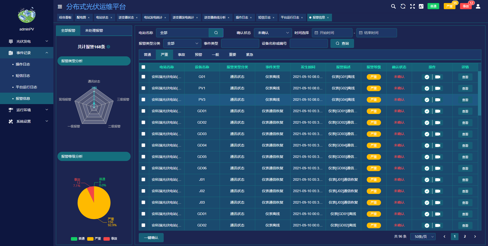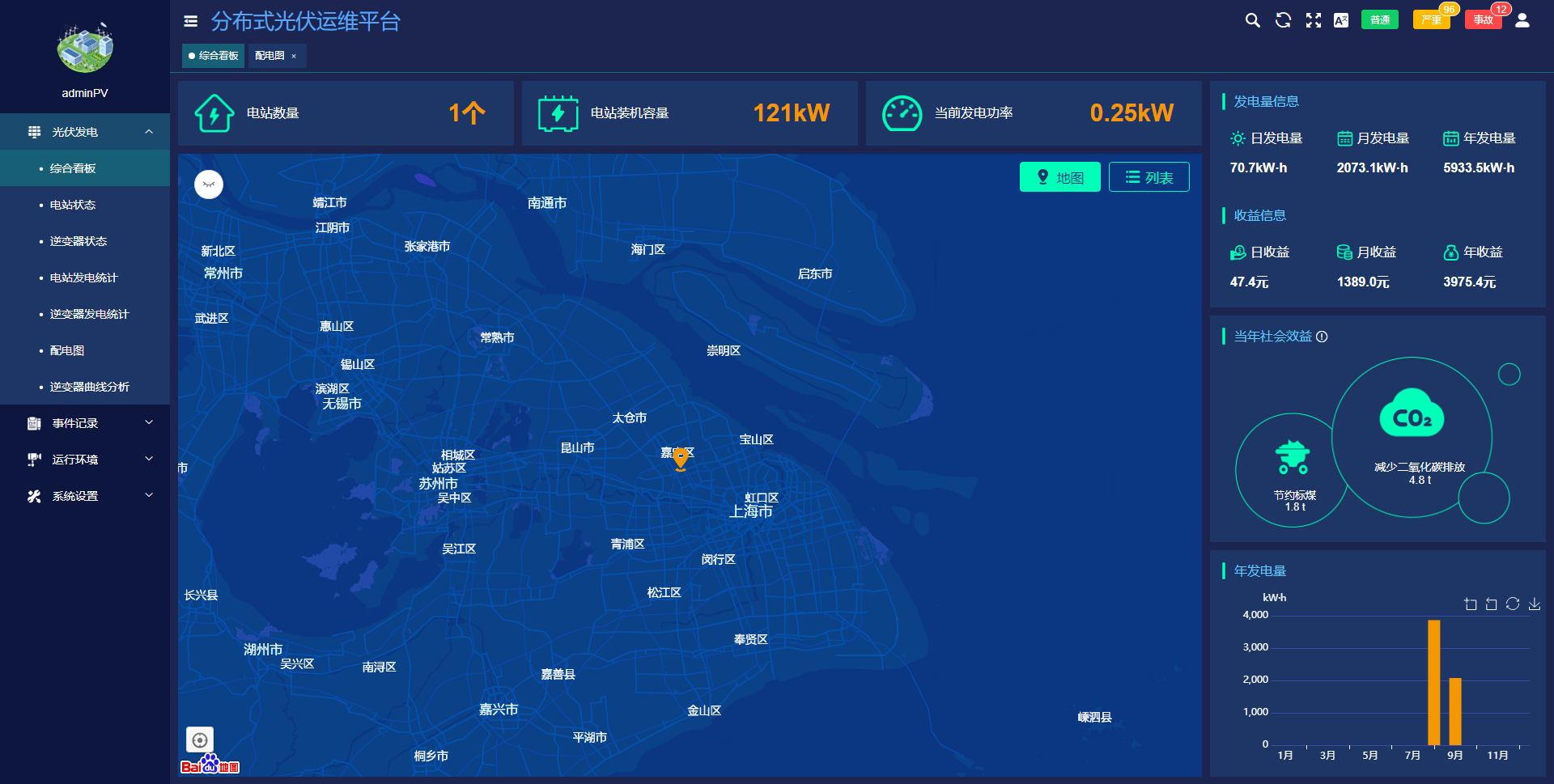 顯示所有光伏電站的數(shù)量,裝機(jī)容量,實(shí)時(shí)發(fā)電功率。