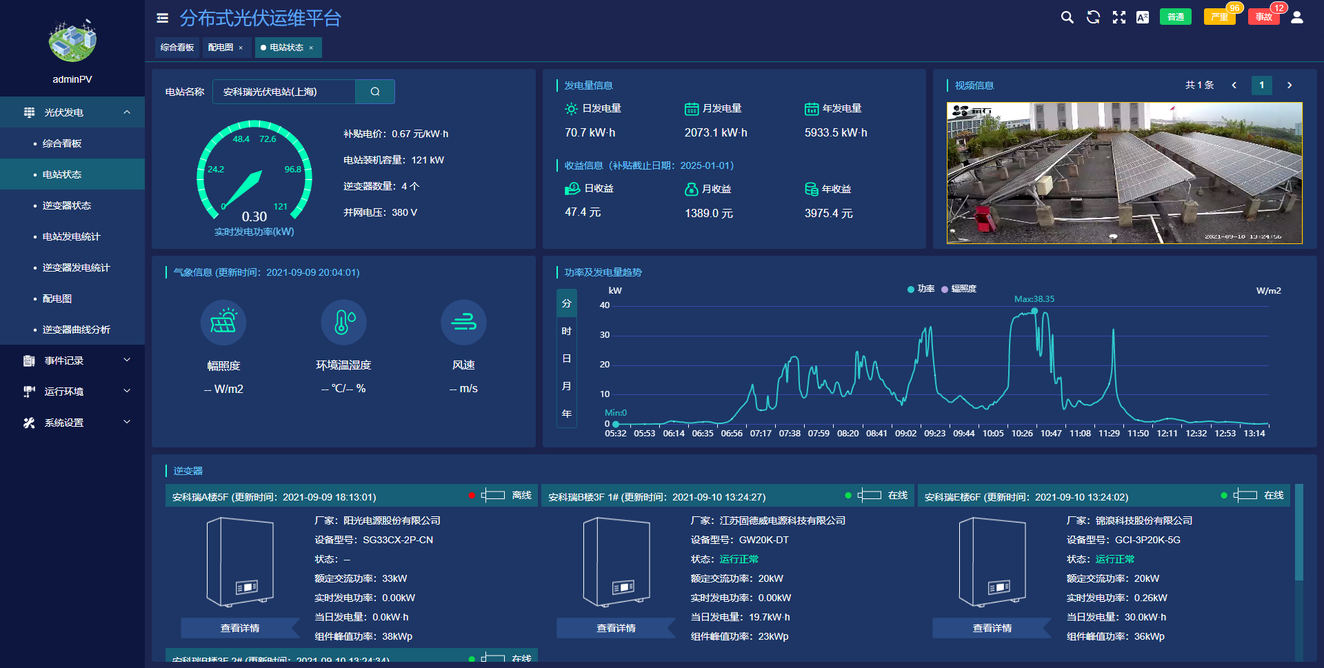 電站狀態(tài)展示當(dāng)前光伏電站發(fā)電功率,補(bǔ)貼電價(jià),峰值功率等基本參數(shù)。