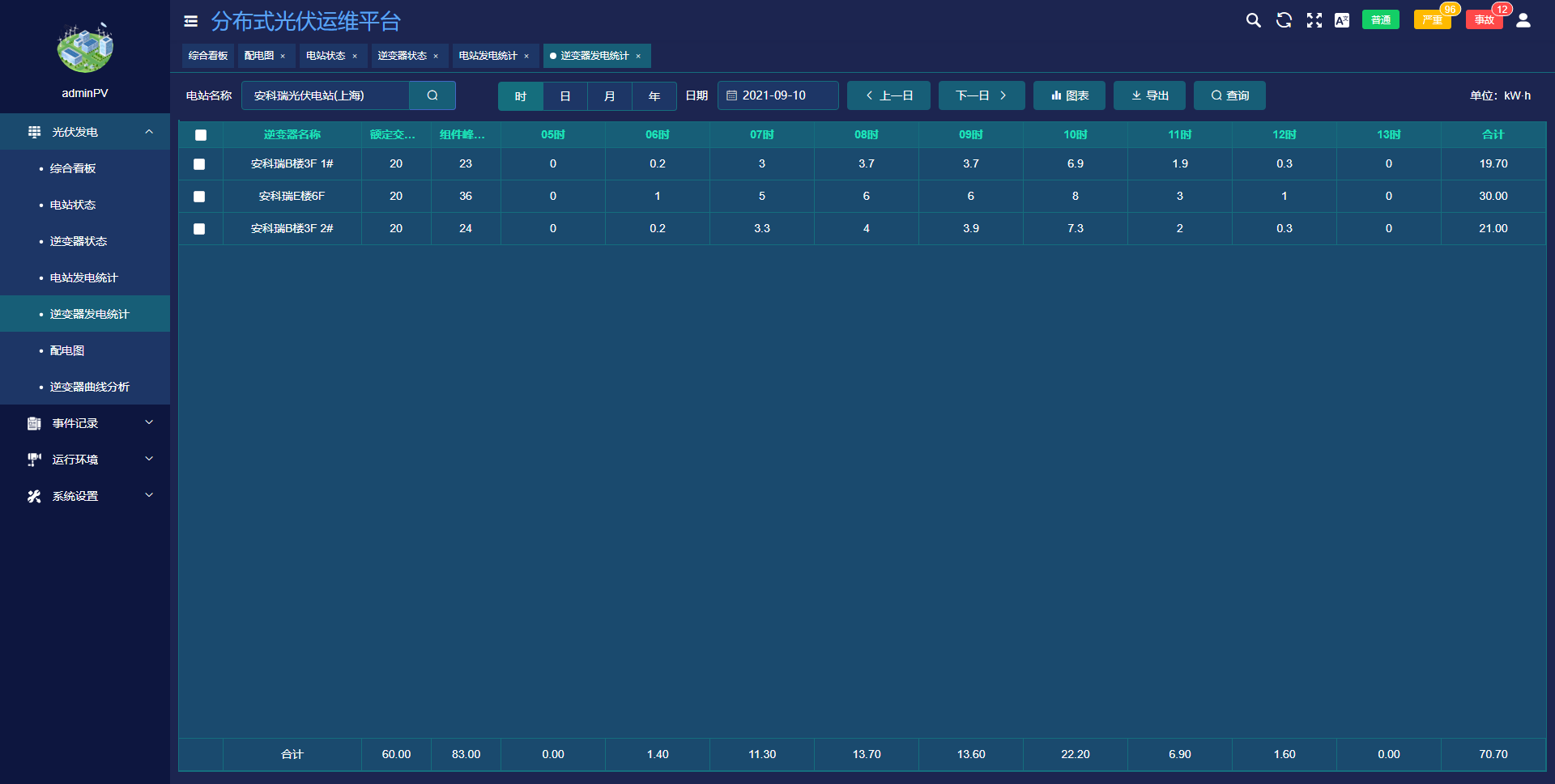 展示所選逆變器的時(shí)、日、月、年發(fā)電量統(tǒng)計(jì)報(bào)表