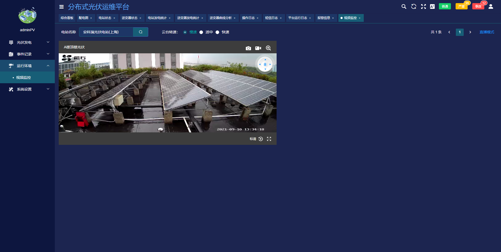 通過(guò)安裝在現(xiàn)場(chǎng)的視頻攝像頭,可以實(shí)時(shí)監(jiān)視光伏站運(yùn)行情況。對(duì)于有硬件條件的攝像頭,還支持錄像回放以及云臺(tái)控制功能。如圖所示。