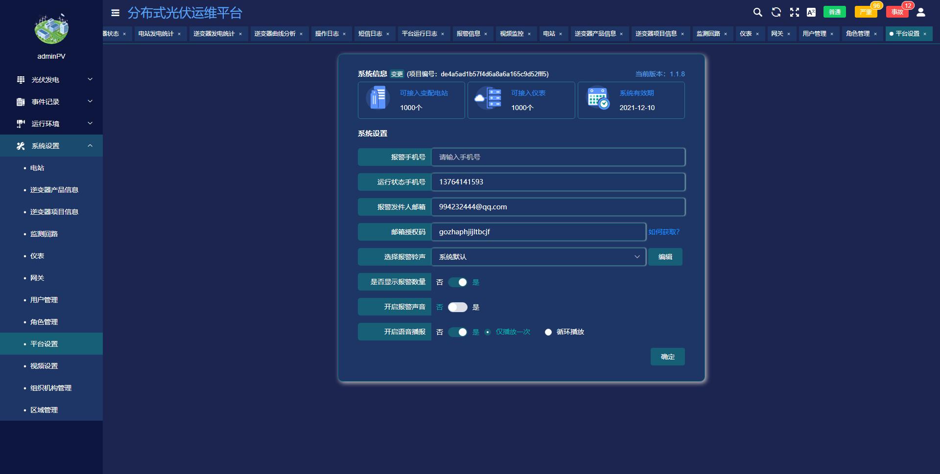 顯示當(dāng)前平臺(tái)可接入最大儀表數(shù)量、系統(tǒng)有效期。可填寫報(bào)警管理人郵箱、手機(jī)、報(bào)警鈴聲、報(bào)警參數(shù)等基本信息。如圖所示