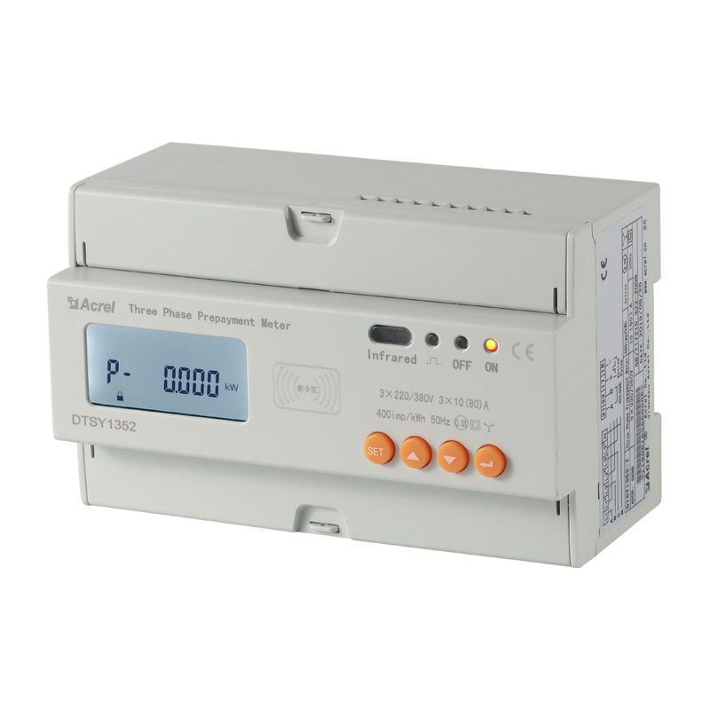 三相內控式預付費電表DTSY1352-NK:三相全電量測量,可支持費控,時控,負控;支持遠程充值;內置磁保持繼電器實現通斷;電流規格:1(6)A和10(80)A,有功電能精度0.5S級;1路RS485/Modbus